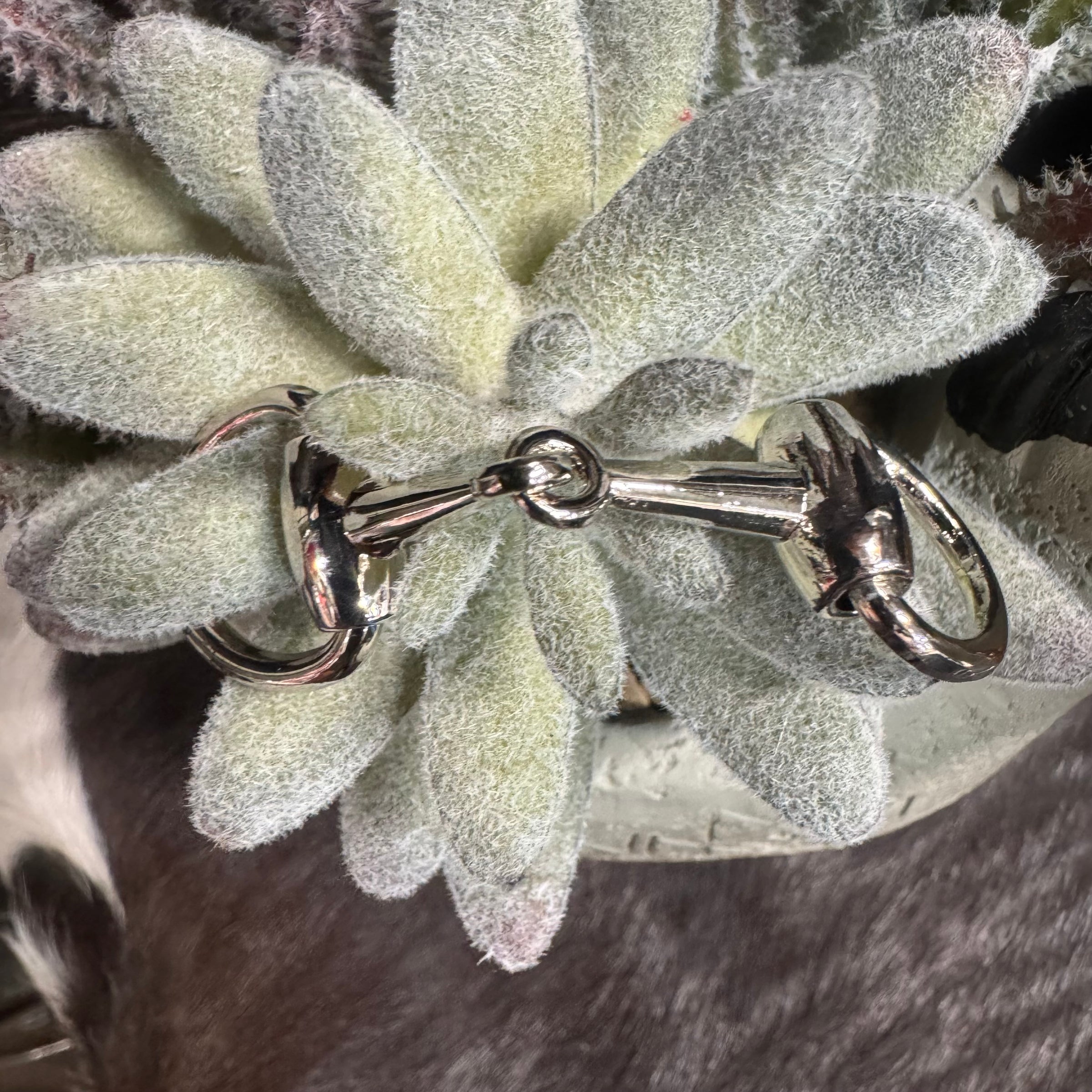 Elevate any outfit with this stunning silver equestrian bit scarf slide. A chic accessory that adds a touch of sophistication and classic style to your favorite scarves, belts, or bags.