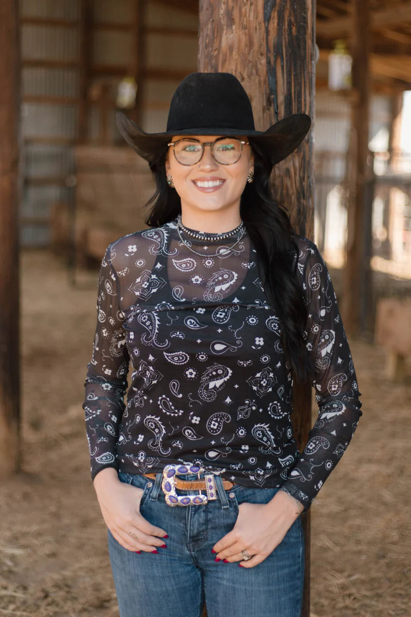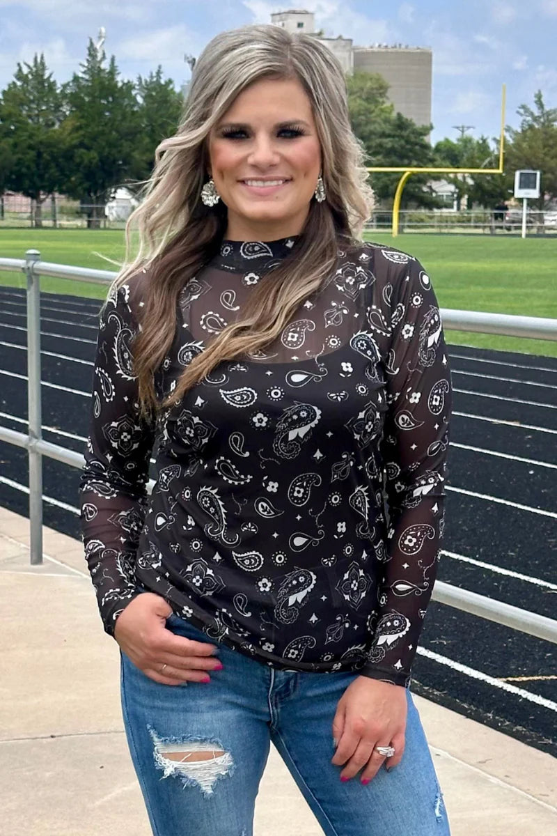 Introducing our Bandana Babe Mesh Top in black! This cute and comfy top features a unique bandana pattern on stretchy black mesh. Perfect for adding a touch of edge to any outfit. Get ready to serve some looks, babe!