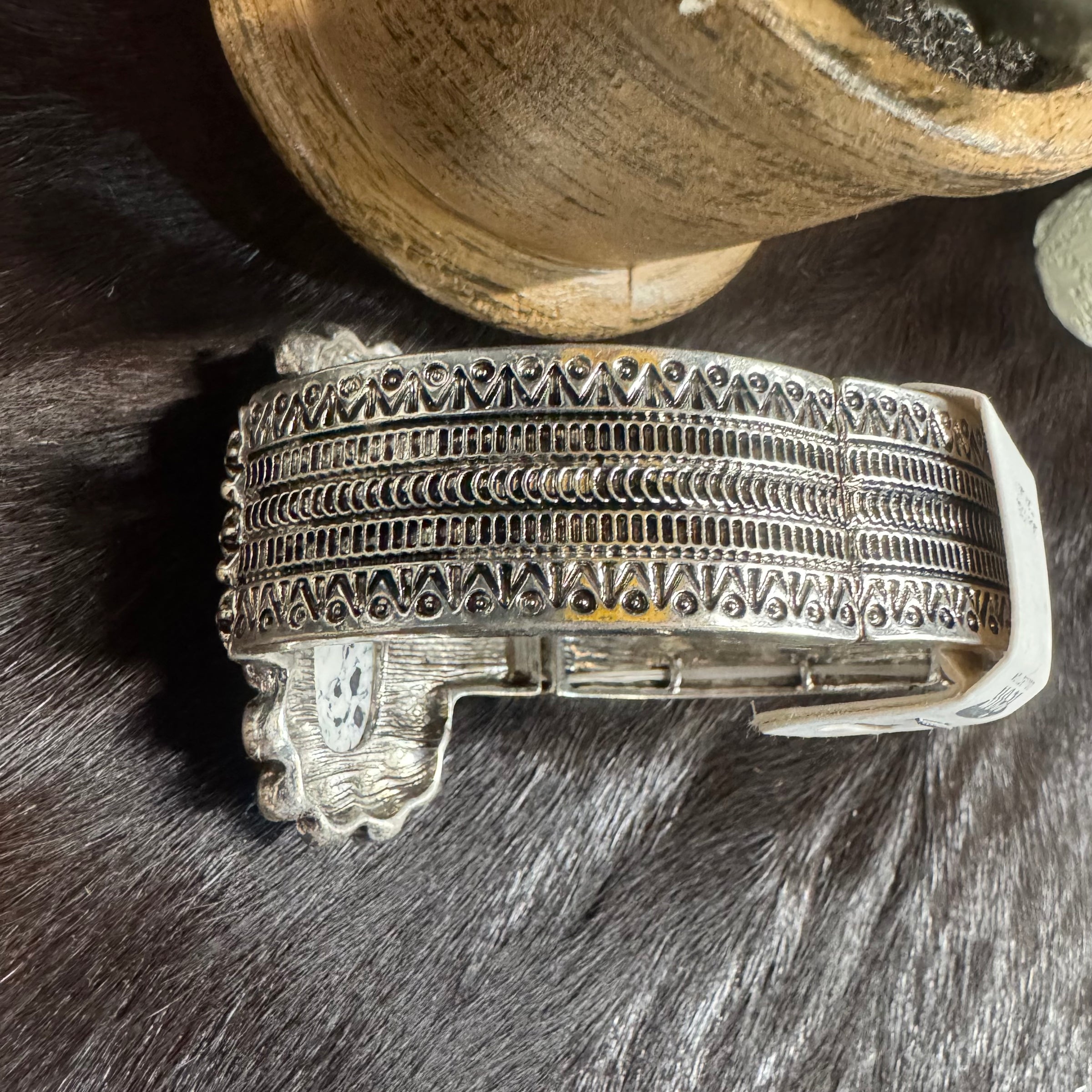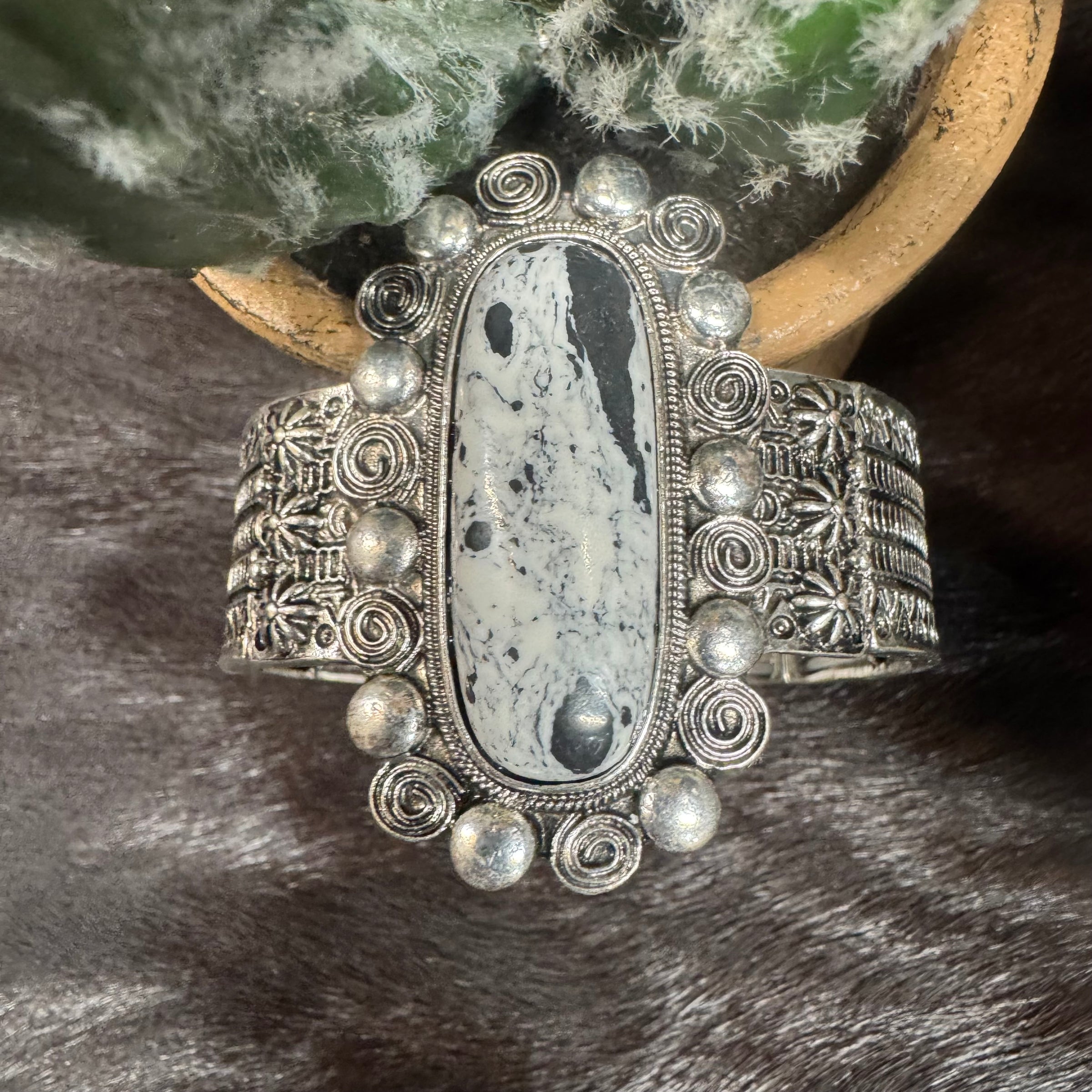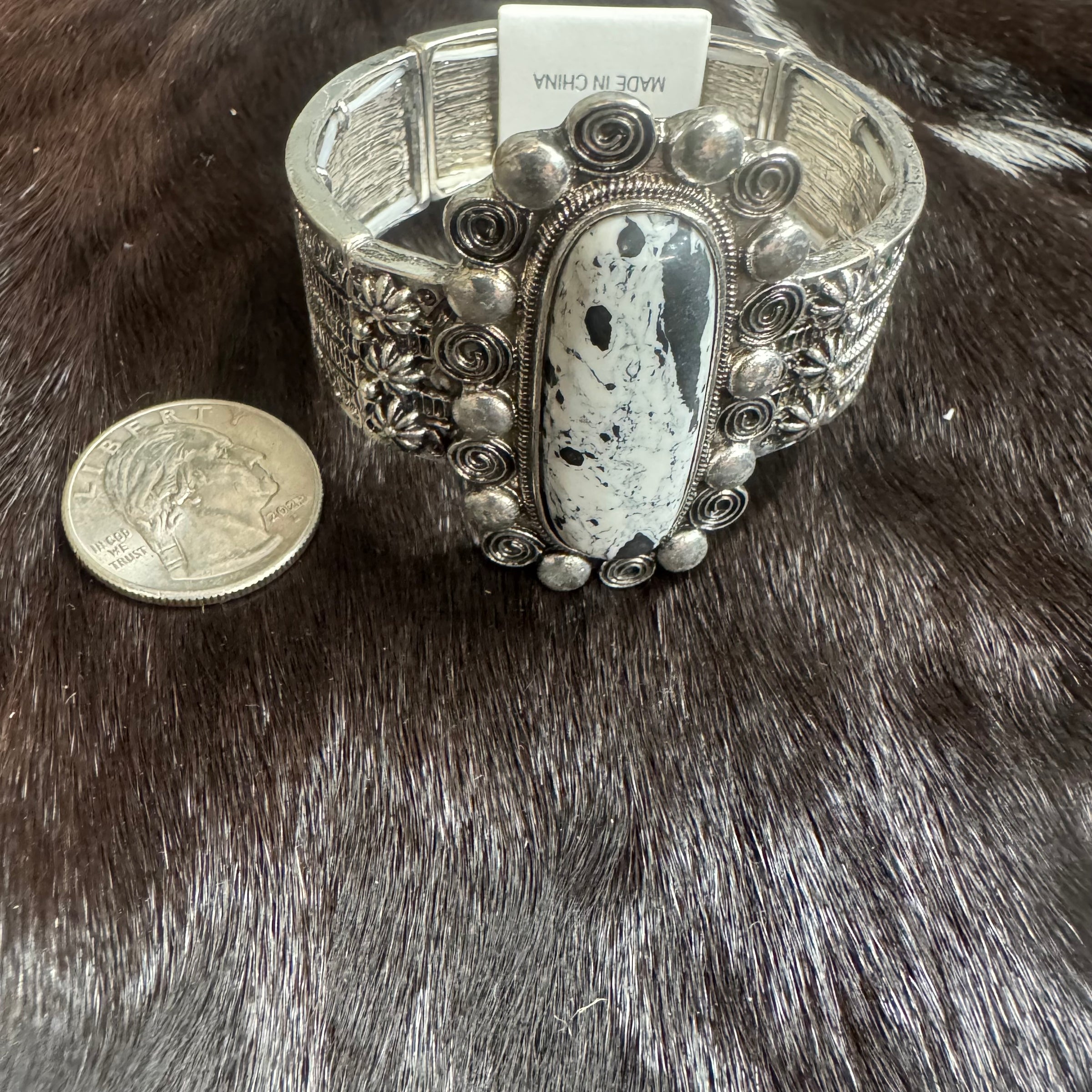 Stretch Bracelet featuring a large, oval, black and white stone, Faux White Buffalo stone. It has an ornate silver-tone setting and a wide, stamped band.