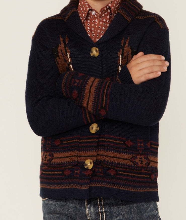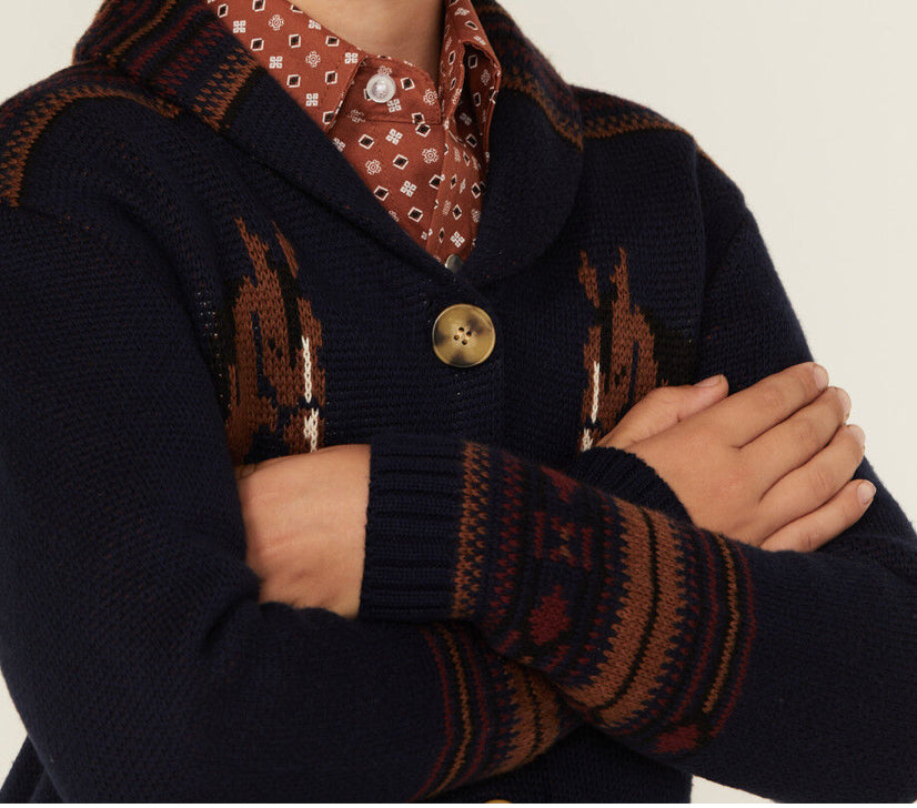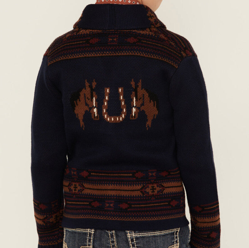 Perfect for your little cowboy or cowgirl! This horse graphic cardigan with a Southwestern design is a stylish and cozy addition to any wardrobe. Made from a durable knit with a button-down placket and shawl collar, it's ideal for everyday adventures.