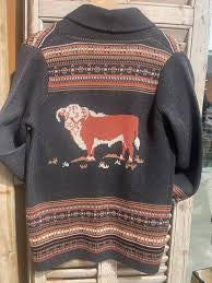 Western stripes and herefords make this cozy sweater irresistible to the whole family. Shawl collar and open pockets. Kids’ four-button cardigan is 18" long in size medium. 100% acrylic knit. Machine washable. Imported. Youth sizes: XS (4), S (6), M (8), L (10), XL (12), XXL (14).