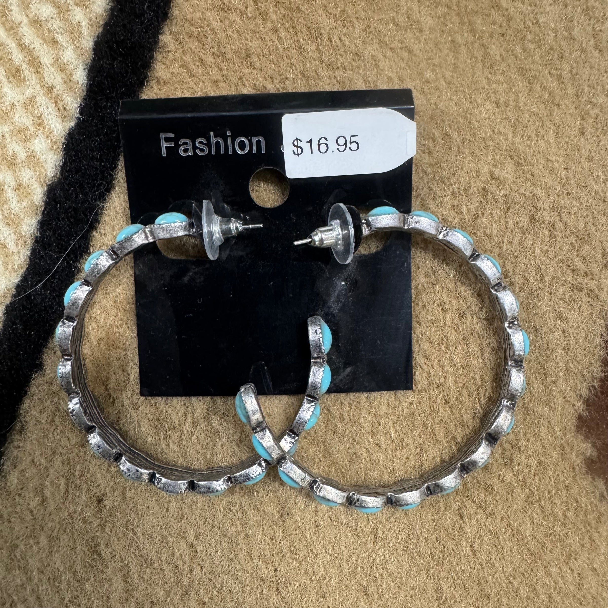These are Southwestern-style 1 7/8” Faux turquoise hoop pierced earrings featuring imitation turquoise stones.
