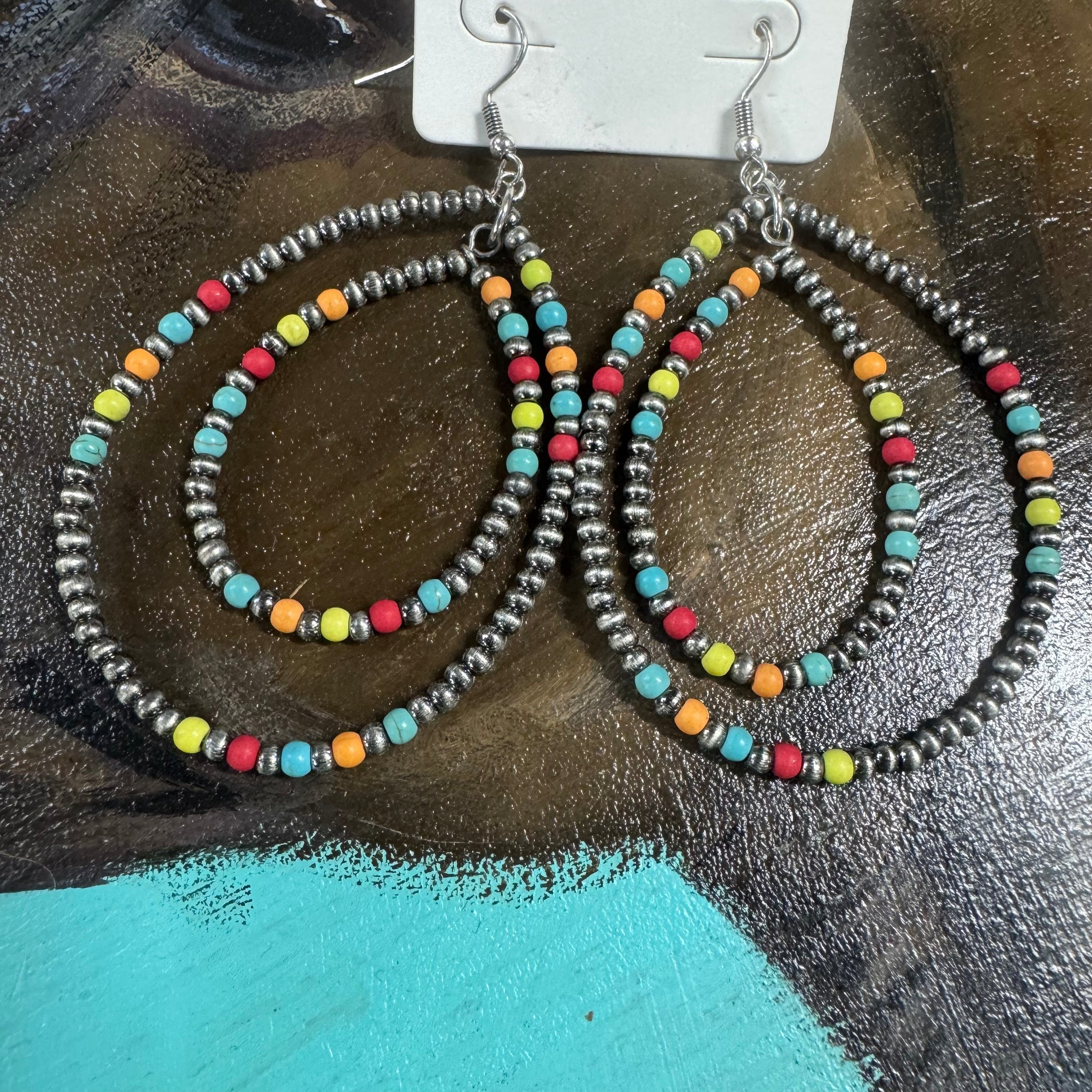 Add a vibrant touch to your look with these stunning double-beaded teardrop dangle earrings! Featuring a beautiful combination of faux silver-toned beads and a playful mix of colorful seed beads, these earrings offer a chic Southwestern or bohemian flair. Perfect for adding a pop of color and unique style to any outfit, they're sure to become a favorite accessory.