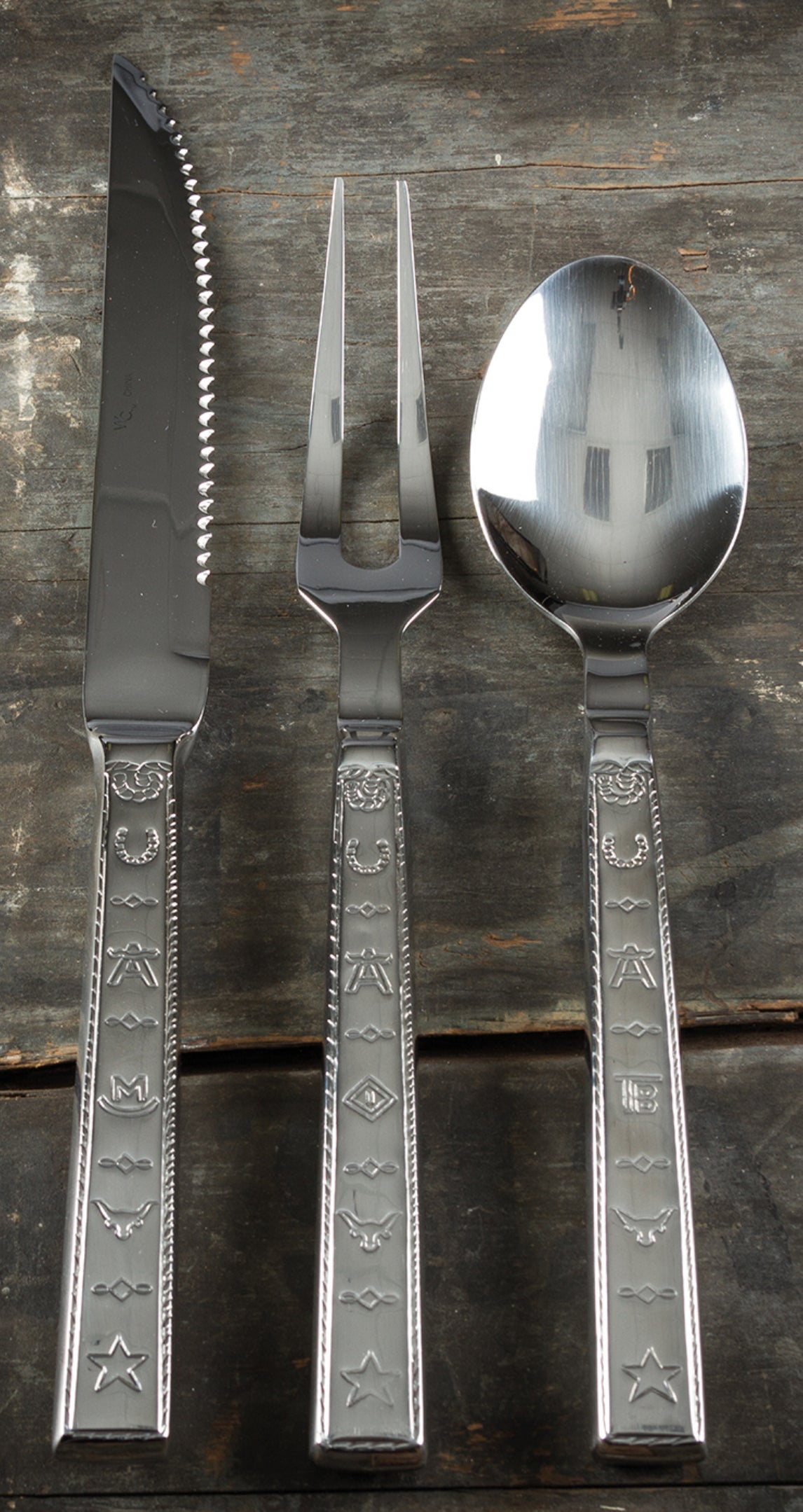 Bring a touch of the Wild West to your table with this stunning western-themed serving set! Featuring intricate cattle brands and a star design on the handles, this durable 18/10 stainless steel set is perfect for any occasion. Whether you're hosting a dinner party or enjoying a family meal, these pieces add a rugged, rustic charm to your dining experience. Dishwasher safe and built to last, this set is a true statement piece for any home.