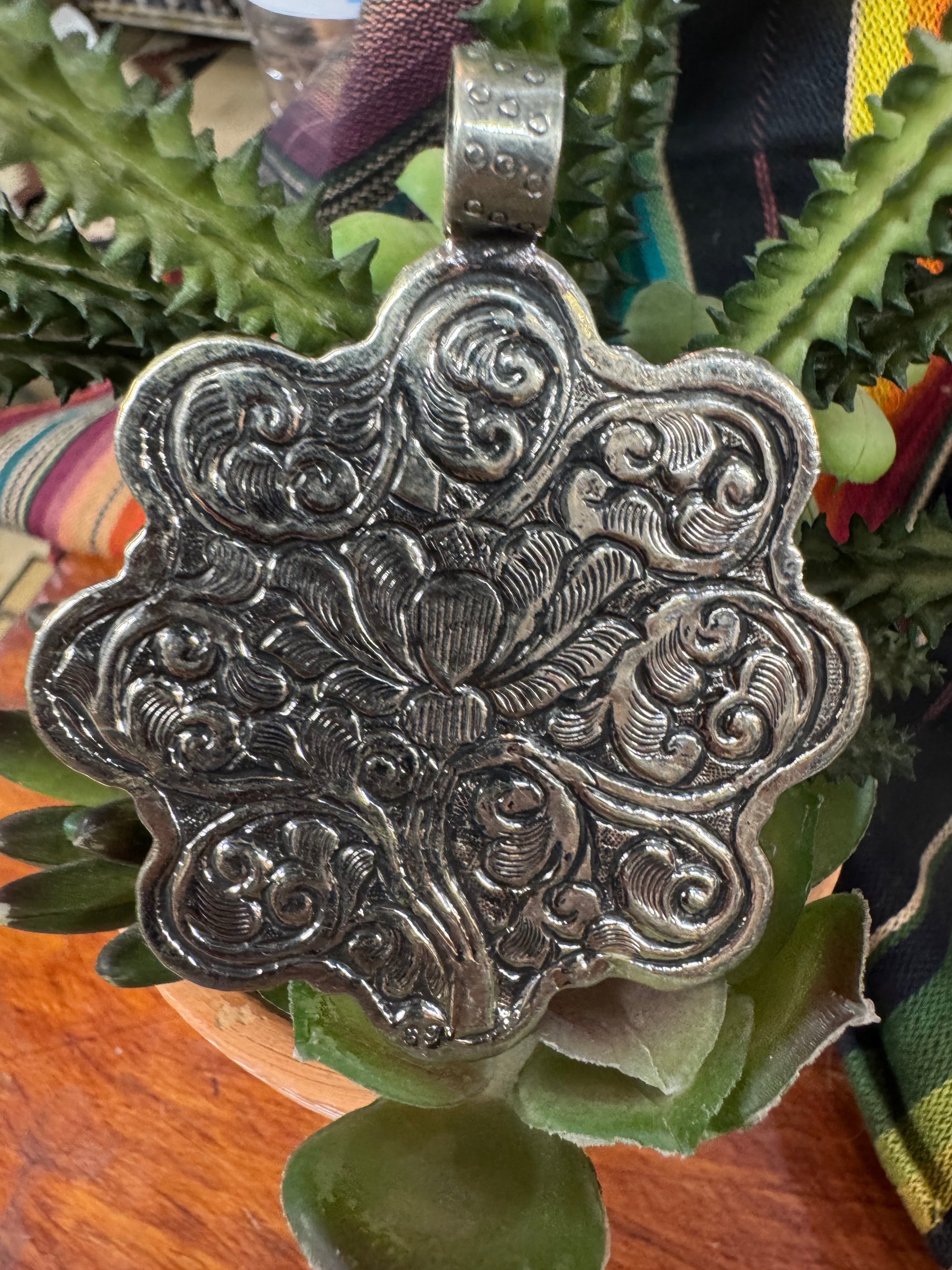 This pendant was made in Tibet and features genuine turquoise from the Himalayas. The stone is set into a floral cluster setting, fairly rough and made of a silver tone nickel alloy or silver plate. The back is stamped in an ornate design. Since the silver is not sterling, we would expect over time to see copper or other metal shine through with age and wear. It's a great piece, funky and retro when worn at the chest or longer.