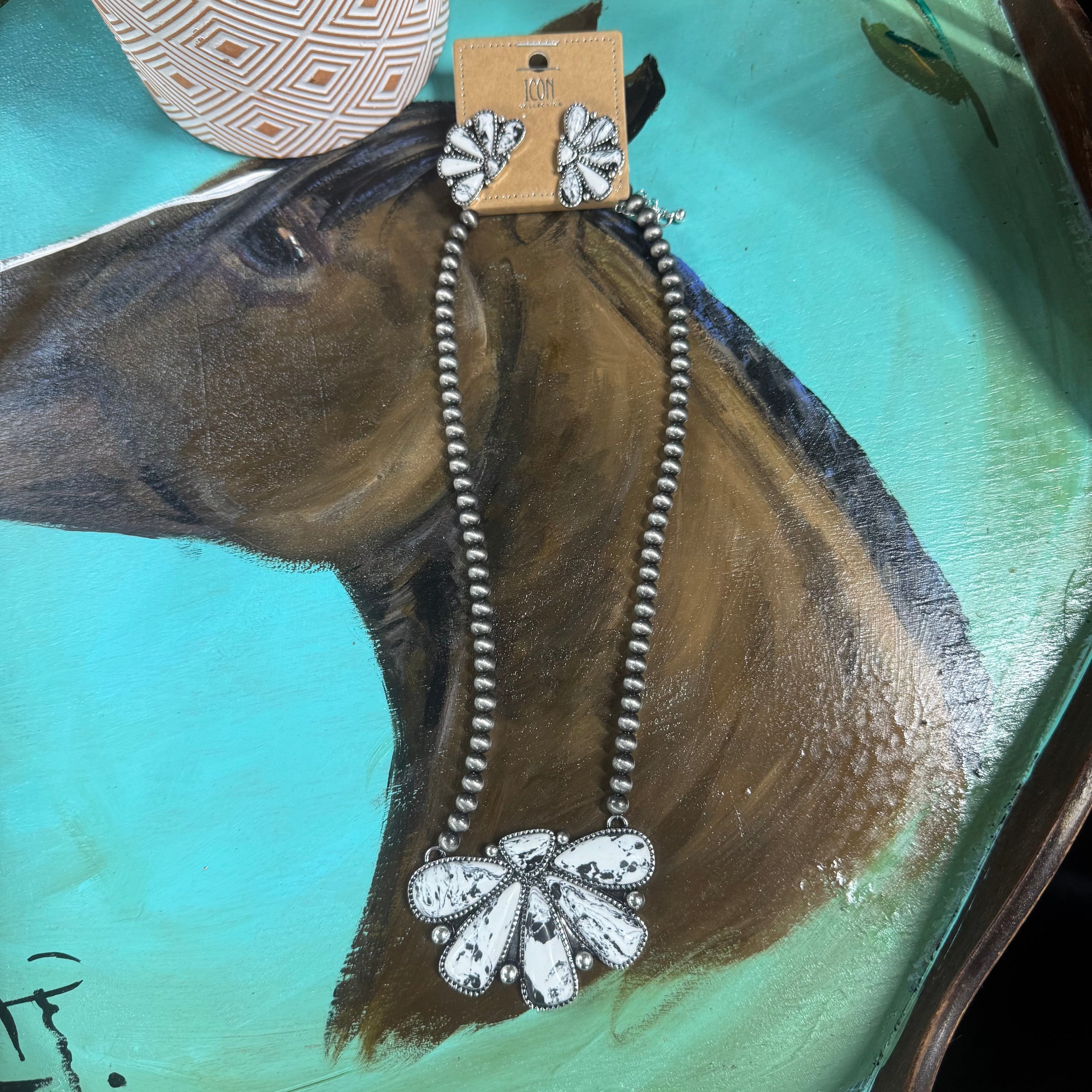 Embrace timeless Western elegance with this stunning faux white buffalo necklace and earring set! ✨ Featuring intricate detailing and a classic squash blossom-inspired design, this set adds a touch of bohemian charm to any outfit. Perfect for everyday wear or a special occasion.