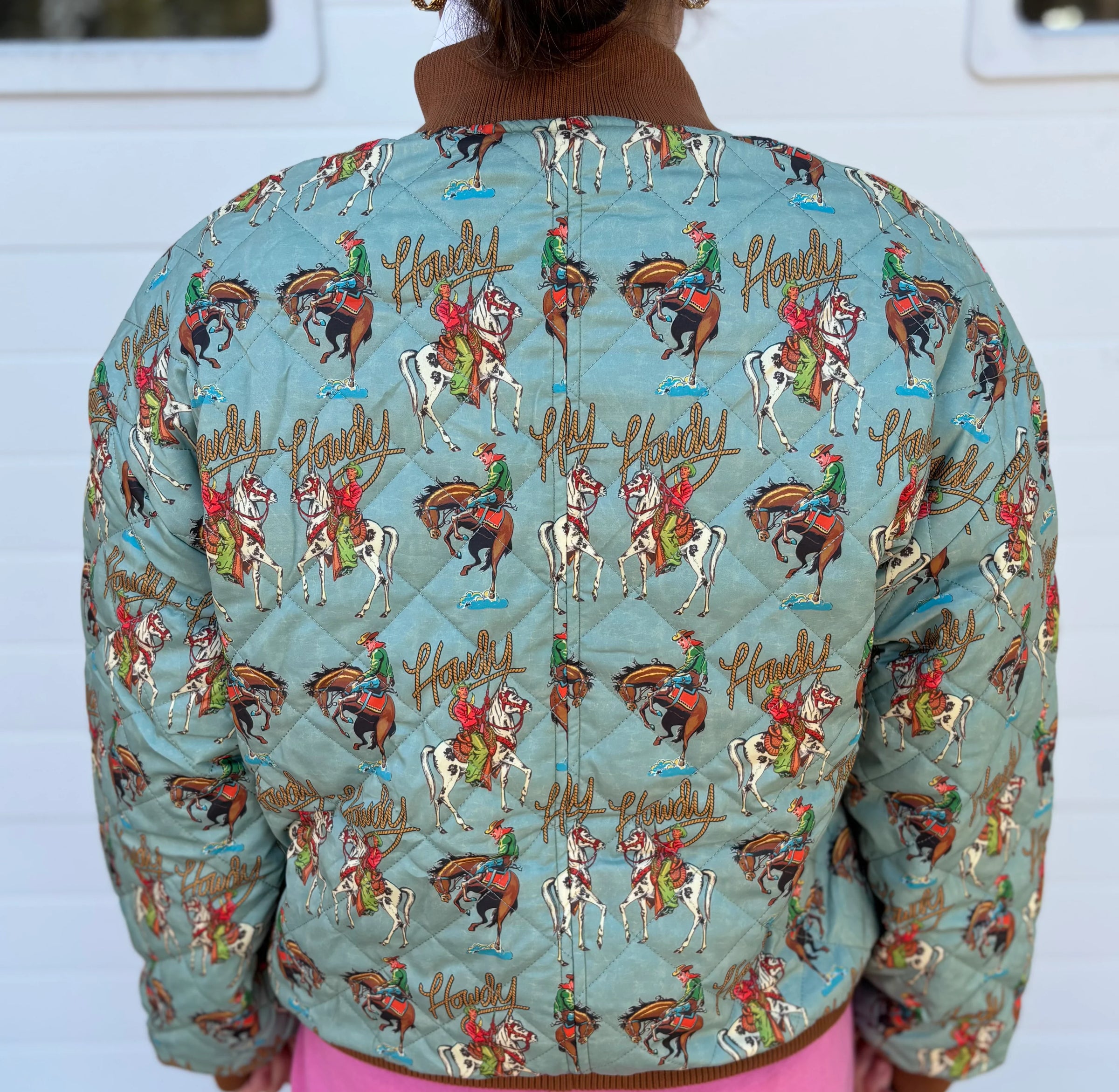 This quilted jacket is a statement piece! The fun cowboy print and classic bomber style make it a perfect blend of vintage and modern. Pair it with comfy pink sweats for a casual, cool look.