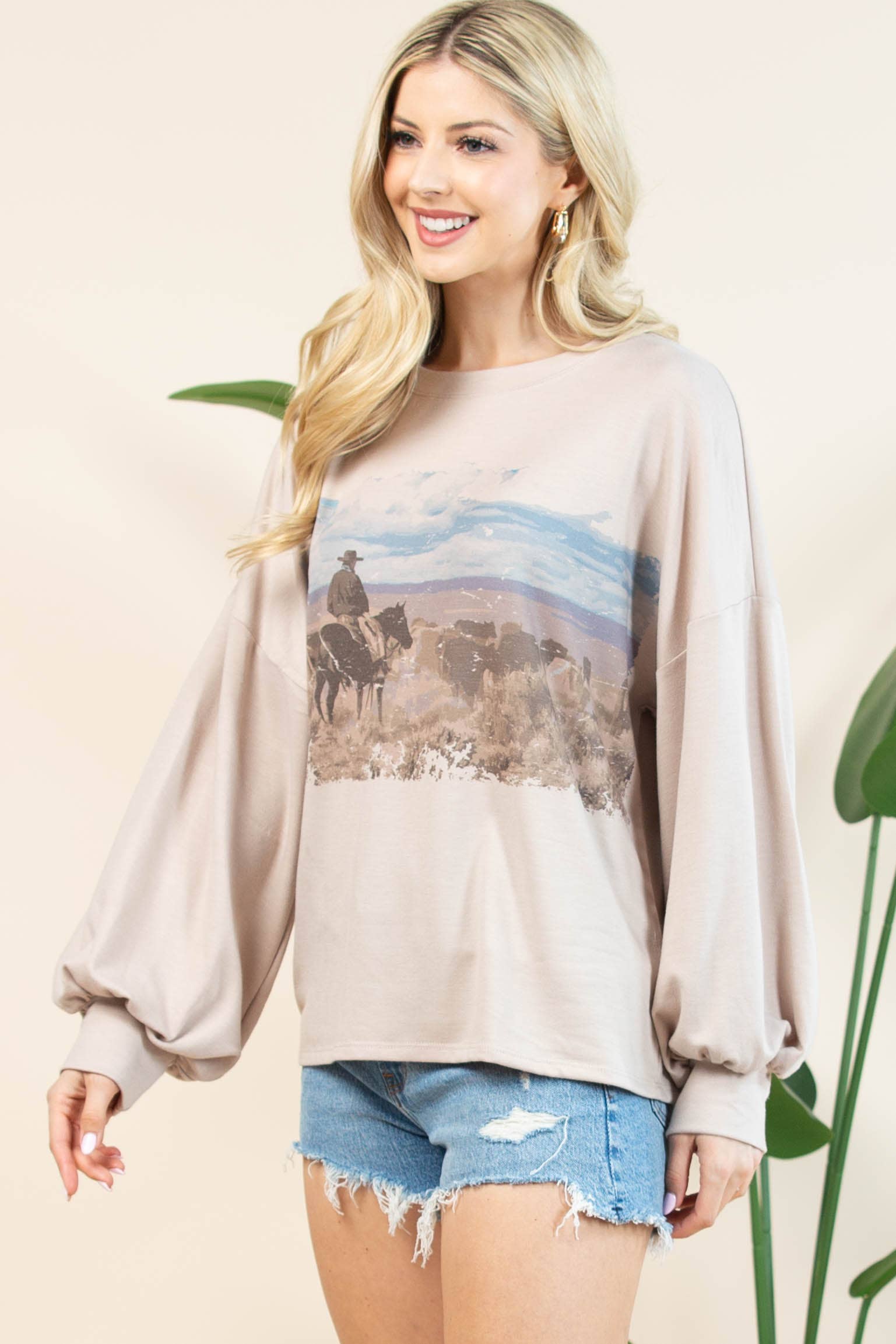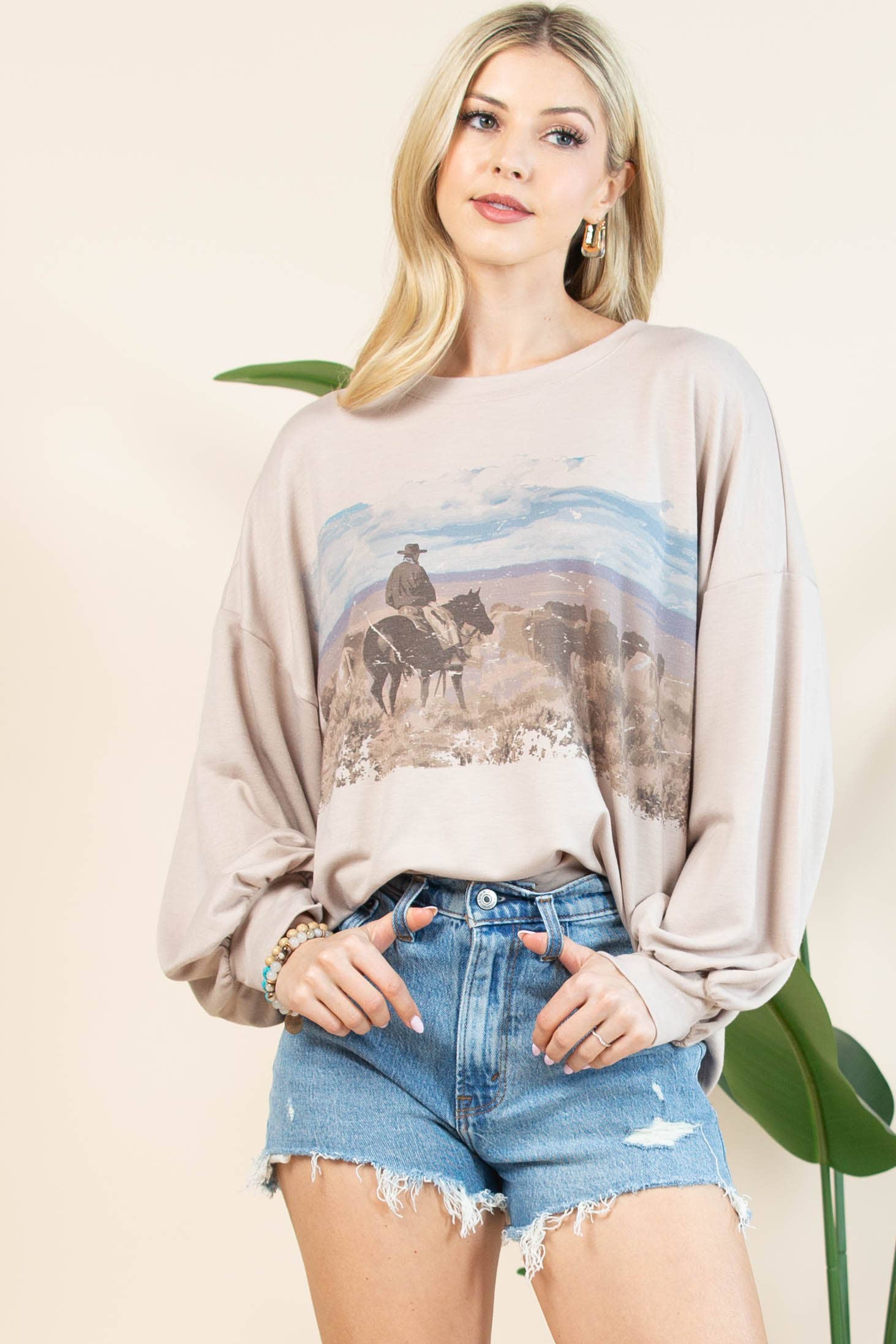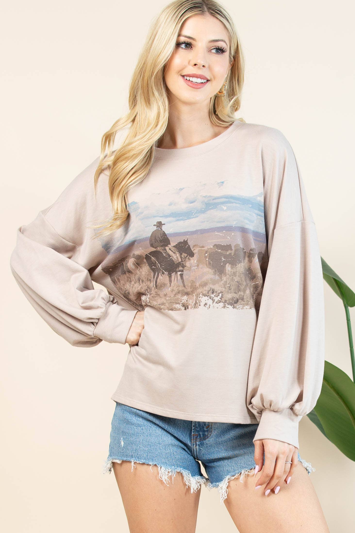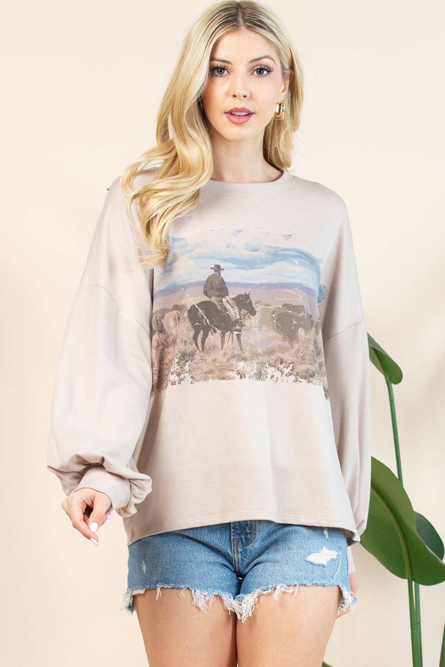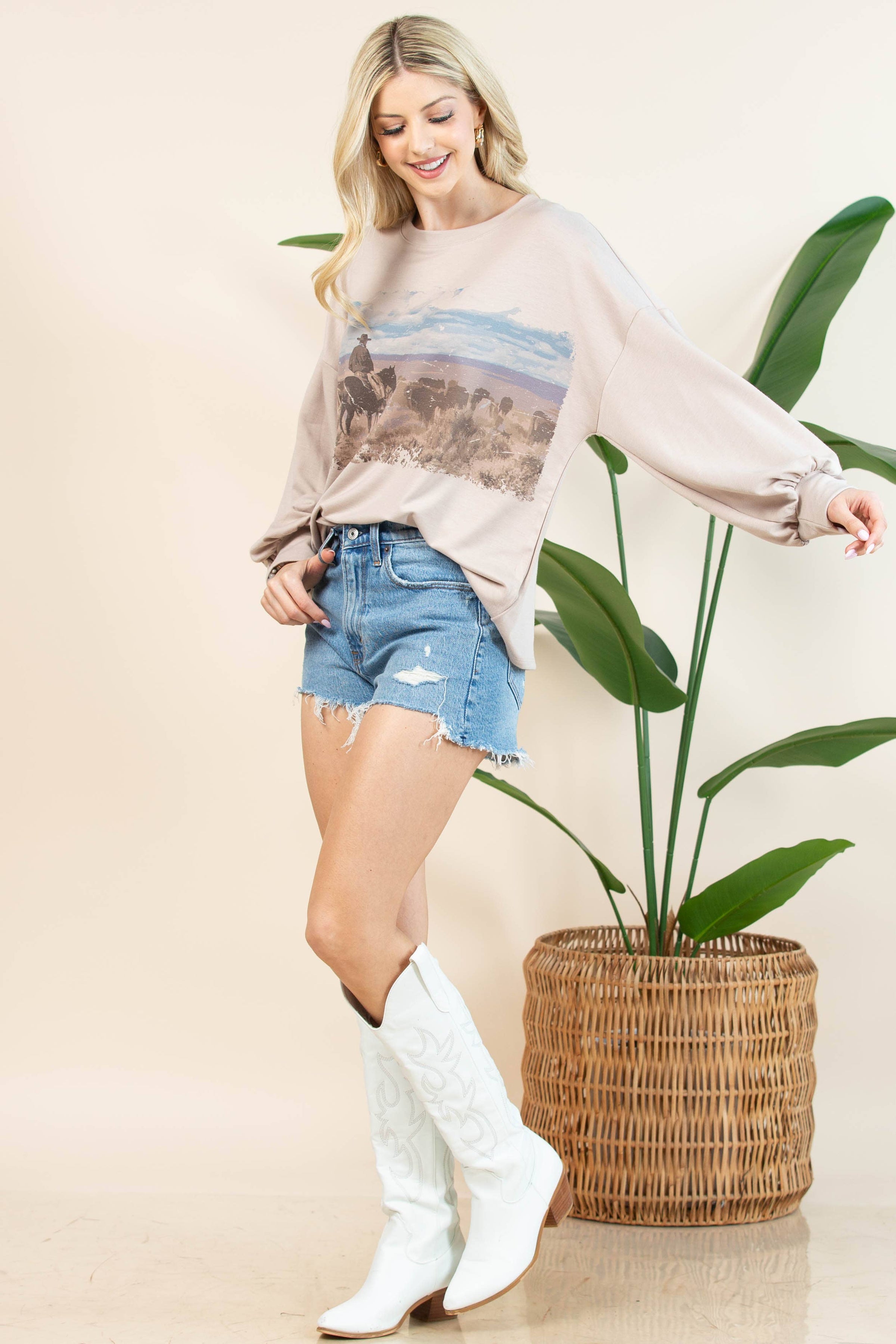 AV1171-VANESSA WESTERN COWBOY GRAPHIC RELAXED SWEATSHIRT : Khaki/Multi / Contemporary