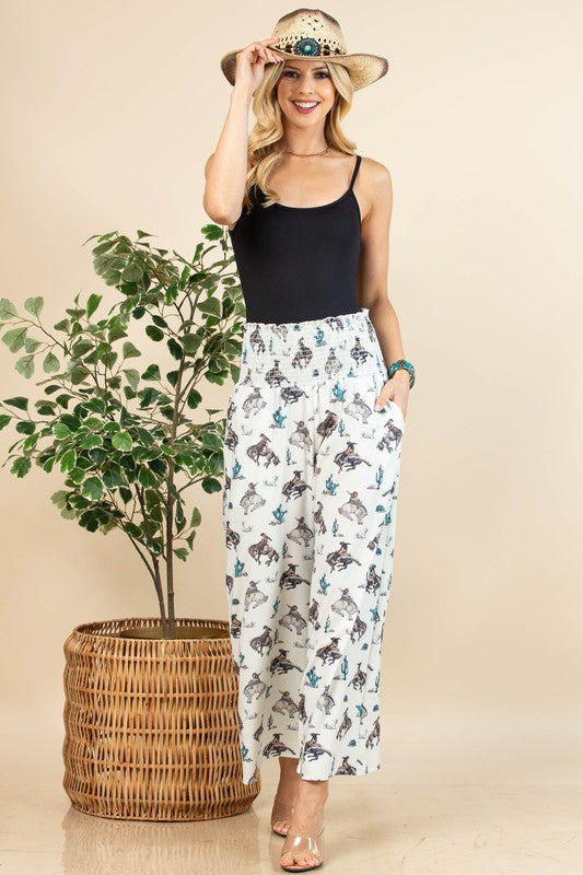 Western Bucking Horses Print Smock Waist Pants